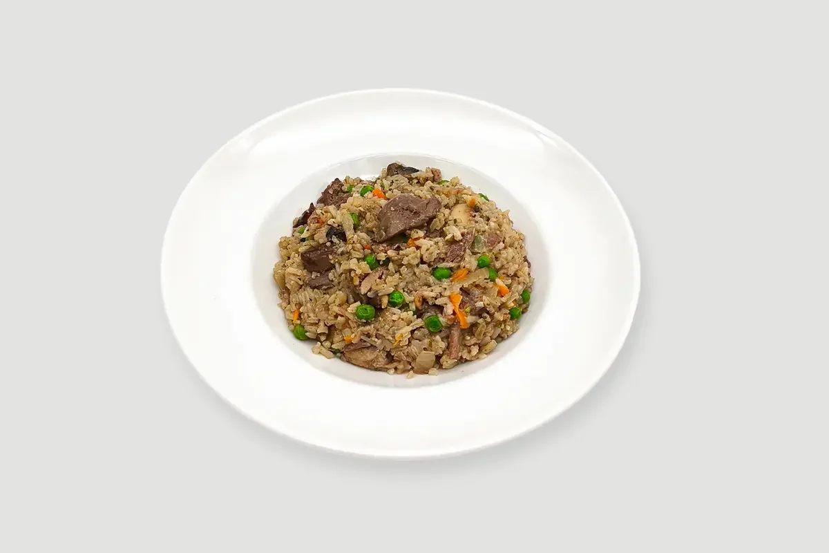 Serpenyőben sült kacsamell, pecsenye libamáj, zöldborsó, gomba, vöröshagyma, fokhagyma, petrezselyemzöld, sárgarépa és fehérrépa rizzsel összeforgatva