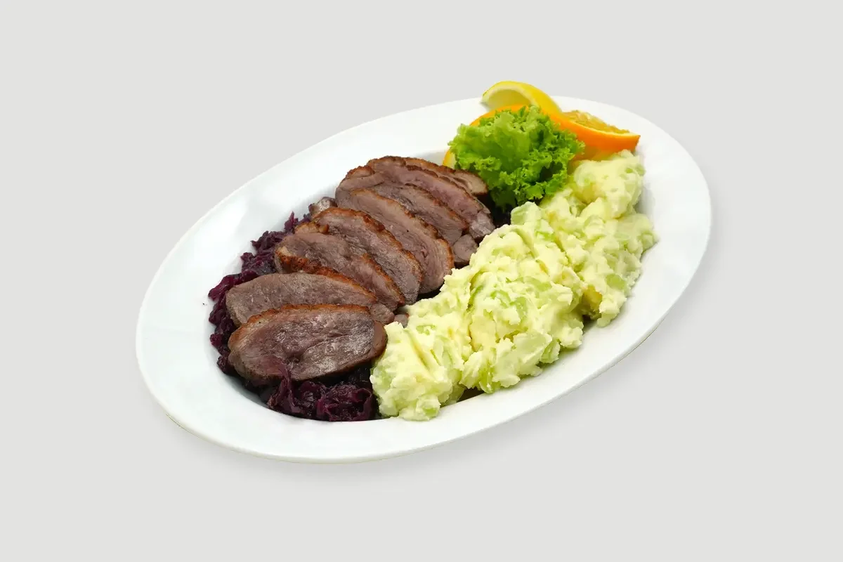 Sült libacomb párolt lila káposztával, gratin burgonyával, barnamártással