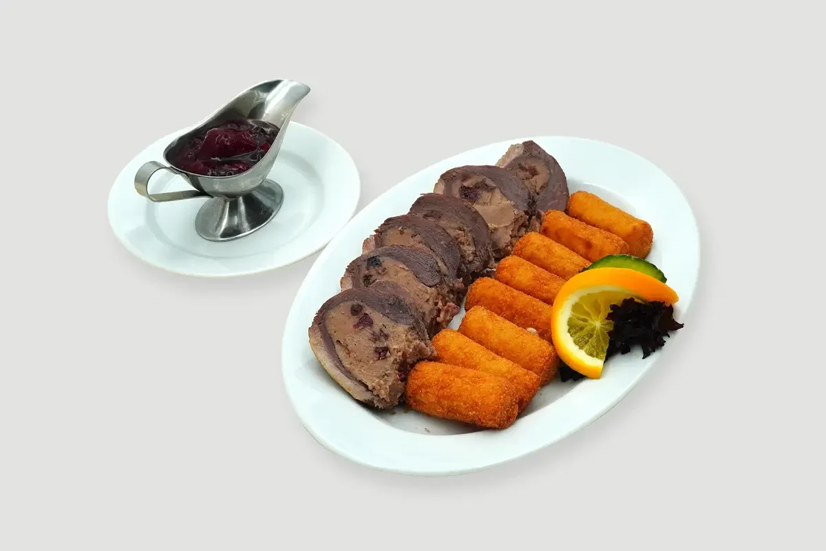 Vörös áfonyával, gesztenyével töltött libamell burgonyakrokettel erdei gyümölcsmártással