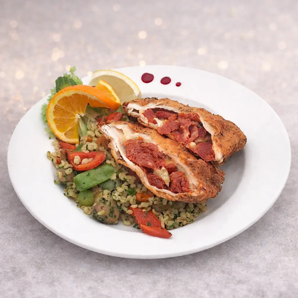 Sous-vide sertésszűz baconkéregben, rózsaborsmártással,